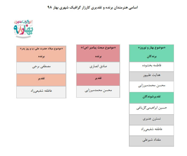 دبیر کارزار گرافیک بهار ۹۸ تصریح کرد: مهرداد احمدیشیخانی، ساره اربابمعروف، اونیش امینالهی، کیانوش غریبپور، مجید کاشانی و مانلی منوچهری اعضای هیات داوران کارزار گرافیک شهری بهار ۹۸ را تشکیل می دهند.