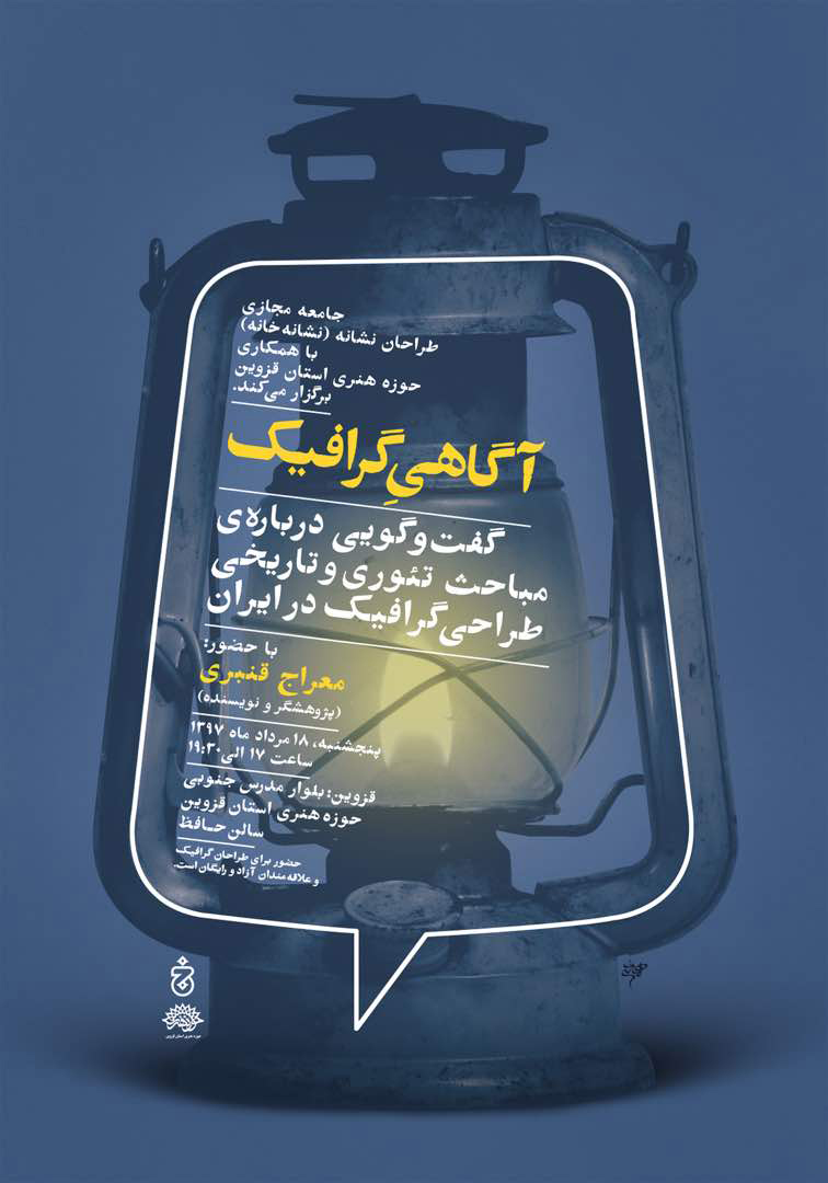 نشستی با عنوان «آگاهی گرافیک» و با موضوع گفت و گویی دربارهی مباحث تئوری و تاریخی طراحی گرافیک در ایران با حضور معراج قنبری در قزوین برگزار میشود.