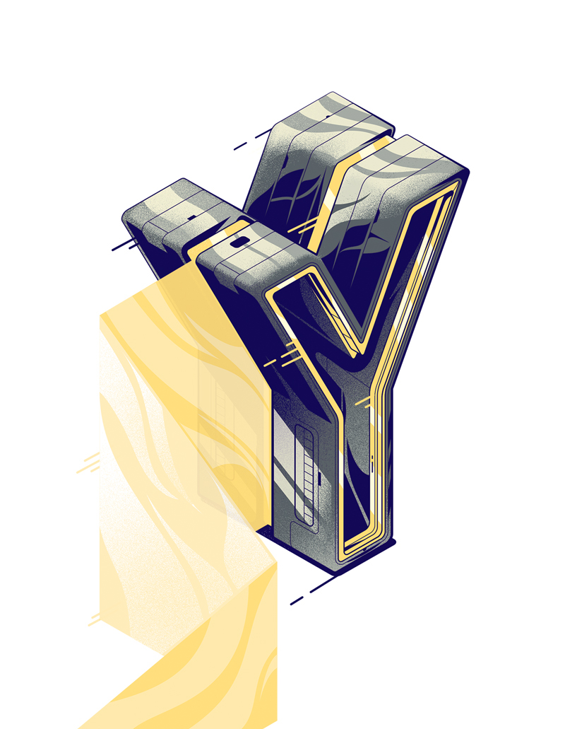 گابریل دربارهی الگوی اولیه این سفارش میگوید: « از آنجاییکه قرار شد طراحی بر اساس حروف کلمه CYBER انجام شود و سفارش دهنده خواسته بود که هر کدام از حروف این کلمه به صورت یک شی به نظر برسد، برای شروع، یک فونت را انتخاب کردم و آن را به صورت نمای سه بعدی در آوردم. به این طریق طرح کلی هر قسمت راحتتر دیده میشد و حفظ خوانایی هر حرف در حین فرایند طراحی نیز ساده تر بود.»