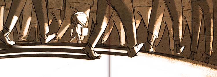 همیشه سعی دارم نورهای دراماتیک و باور پذیری را در کارم بوجود بیاورم و انتخاب و اجرای این نورها همیشه از جذاب ترین و بهترین چالشهای من در تصویر سازی است؛ اما در واقع مخاطب، سختترین و پیچیدهترین چالش من بوده است که چطور میتوانم مجبورش کنم تصویر غمباری را ببیند یا داستان دردناکی که میخواهم تعریف کنم را تا انتها دنبال کند؛ حتی اینکه تا چقدر غم می شود در این تصویر گنجاند. برای همین نمونه های مشابه تصاویر کودک را زیاد دیدم و اینکه چه چیزی توجه مردم را جلب خواهد کرد. مشکل دیگر، خودم بودم که چطور تصاویر، تبدیل به غر زدن های کودکانه نشوند و داستانی را از ابتدا تا انتها بدون درگیر شدن احساسات شخصیام روایت کنم.»