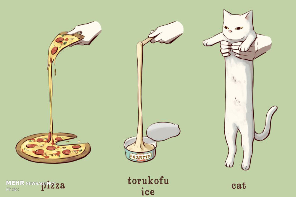 این هنرمند ناشناس به گربه علاقه خاصی دارد گاهی میان کارهای تلخ و گزندهاش شوخ طبعی هم میکند. شاید خیلیها کش آمدن پنیر یک پیتزا را با کش آمدن بستنی ترکی مقایسه کنند اما چه کسی این دو را با یک گربه مقایسه میکند؟ جواب مشخص است.