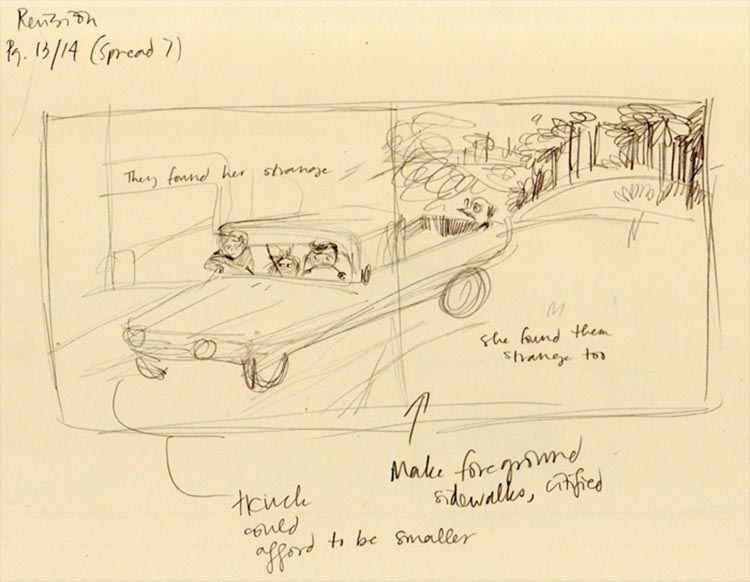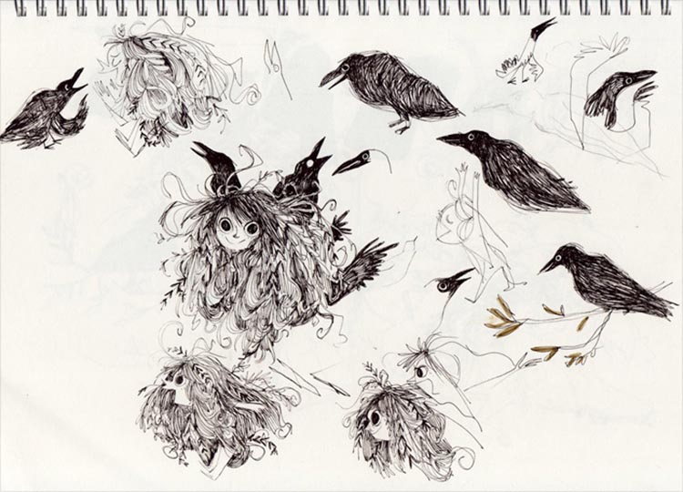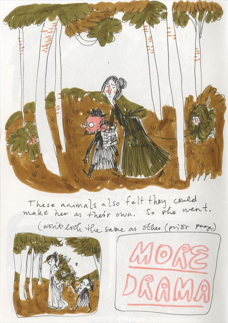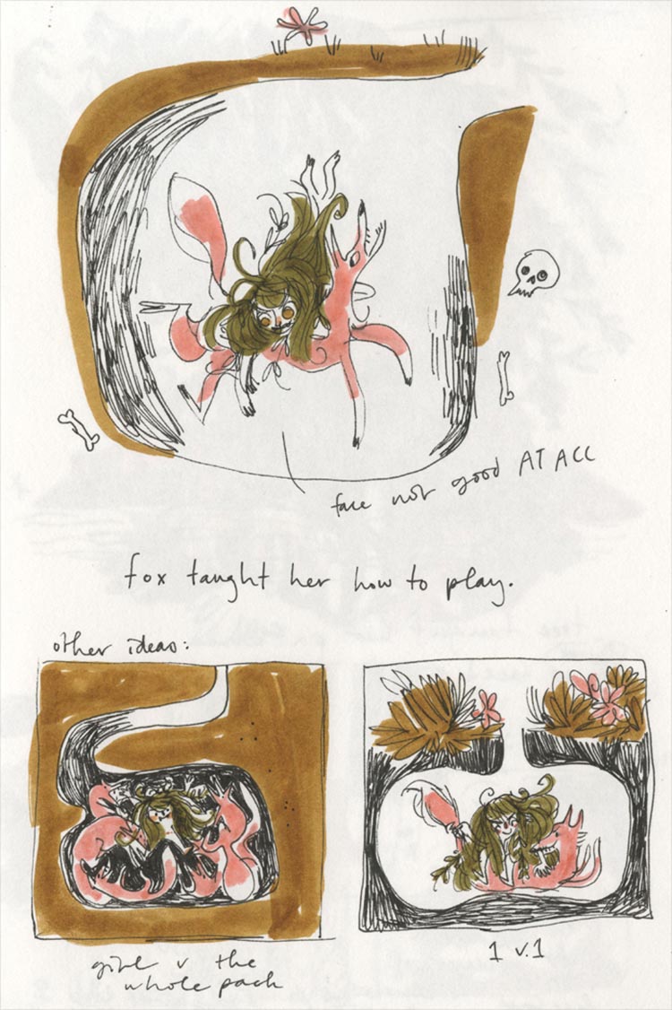 از یک کتابچه طراحی کوچک شروع کردم. معمولاً از یک کتابچه طراحی A5 استفاده میکنم و سعی میکنم در آن تصاویر کوچکی را خلق کنم که ایده مربوطه را در خود خلاصه کنند. از آن جایی که معمولاً در کنار هر خط داستان یک تصویر قرار میدهم، میبایست در این مرحله از ویرایش بسیار دقیق و بیباکانه عمل کنم. قرار دادن متنی بسیار کوتاه در کنار تصویری که باید برای بیان داستان در فضایی کوچک قرار بگیرد امری چالش بر انگیز است، اما این امر به من کمک میکند داستان را بهتر تعریف کنم. اگر نتوانم داستان را در این کتابچه طراحی بیان کنم، باید اصلاحاتی اعمال شود – که در “وحشی” از این دست اصلاحات بسیار بود!