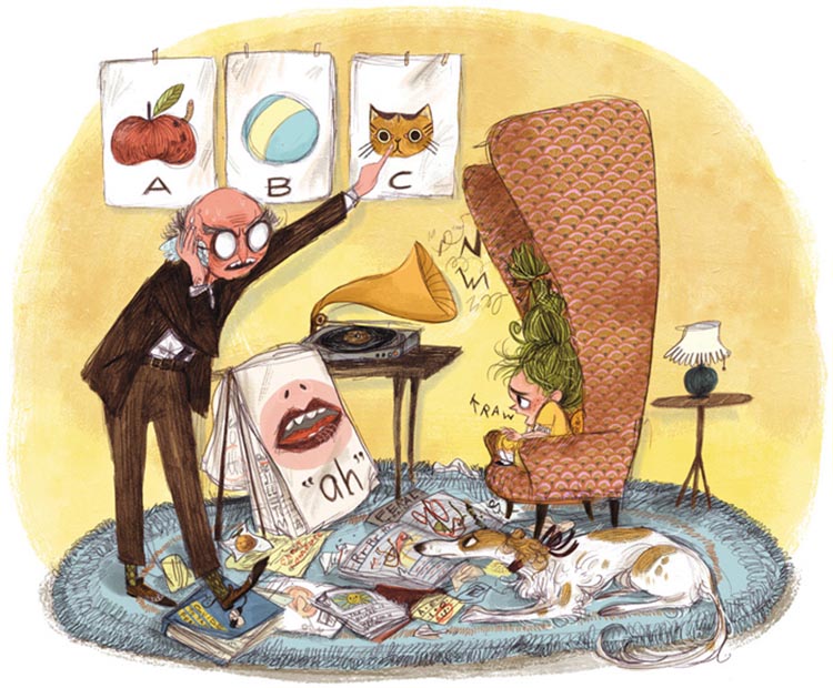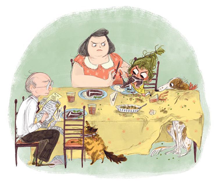در مورد رنگ ها، این کار را به صورت کاملاً دیجیتالی در فتوشاپ بر روی اسکنهای اولیه انجام میدهم. طراحی صحنههای خارجی برایم طبیعیتر و آسانتر بود؛ این فضاها مملو از رنگ سبز و قهوهای بودند (قهوهای رنگ مورد علاقه ام است. صحنههای داخلی دشوار بود. فضاهای خالی و لبههای سخت بسیاری وجود داشت. نمیدانستم باید از رنگهای پر زرق و برق مبلمان نیمه قرن بیستم استفاده کنم یا رنگهای ملایمتری که در خانه مادربزرگم پیدا میکردم. اندکی رنگ روشن زشت وجود دارد، اما بیشتر تصاویر تیره هستند.