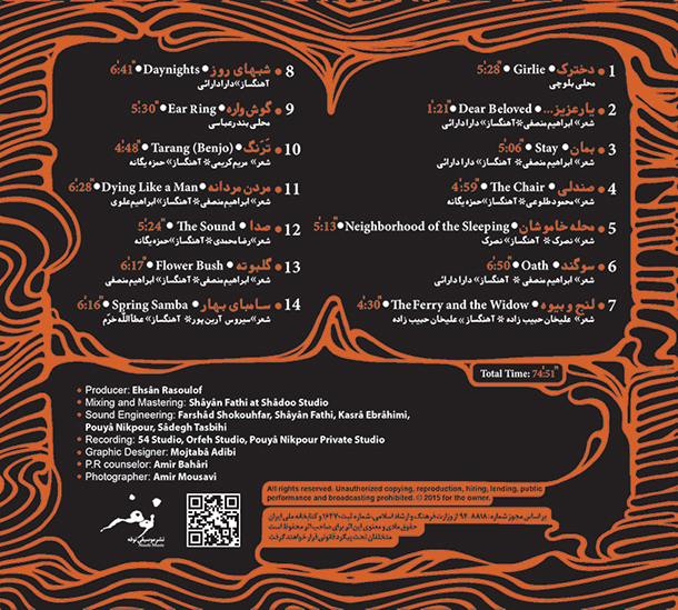 پالت رنگی آلبوم بعد از مشورت با اعضای گروه و تهیه کننده انتخاب شد. رنگ های نارنجی قرمز و زردکِرِم با الهام از غالب رنگی فرش خاکی جزیره هرمز انتخاب گرديد و در نهایت رنگ سياه به عنوان مکمل این دو رنگ و کامل کننده هارمونی انتخاب شد.