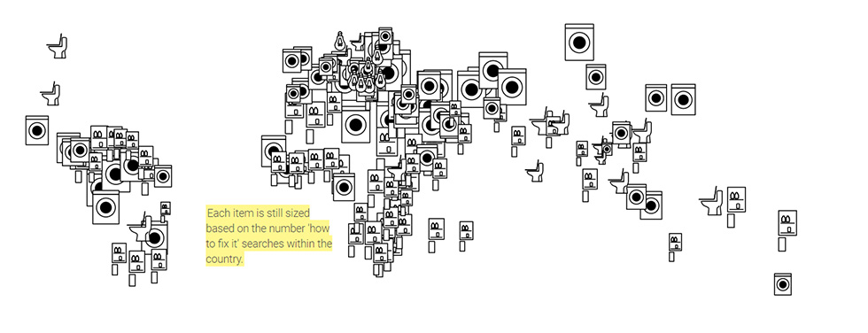 در این سایت؛ مردم میتوانند ابتدا منطقه و کشور خود را انتخاب کنند و بعد بیشترین جستوجو درباره «چگونگی تعمیر» یا «How To» وسایل مختلف خانه را مشاهده کنند. این قابلیت سایت کمک میکند تا مردم هر کشوری بتوانند سریعا راهحل رایجترین مشکلات اطراف خود را پیدا کنند. مثلا این سایت میگوید در کشور کانادا خرابی در، یخچال و توالت شایعتر از دیگر وسایل آشپزخانه است. (در ایران جستجو برای تعمیر یخچال)