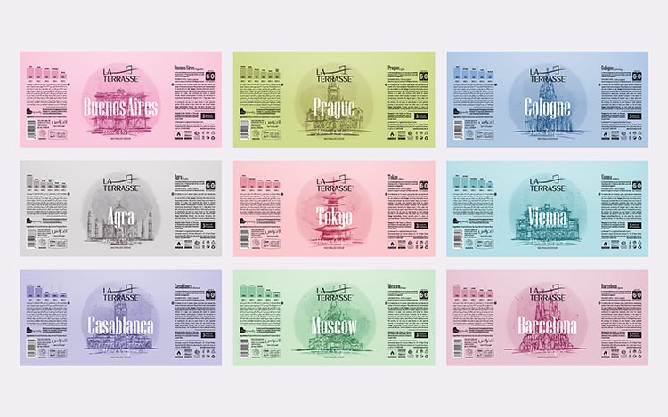 در طراحی بسته بندیها بر اساس ایدههای به دست آمده تصمیم گرفته شد که از تکنیک تصویرسازی آبستره (abstract illustration) استفاده کنیم. بعد از انتخاب شهرها، بناهای مهم و تاثیرگذار آنها انتخاب و تصویرسازی شد. با توجه به هويت و حال و هواى كلى هر شهر، رنگها انتخاب و در نهایت بسته بندی ها دیزاین شدند.