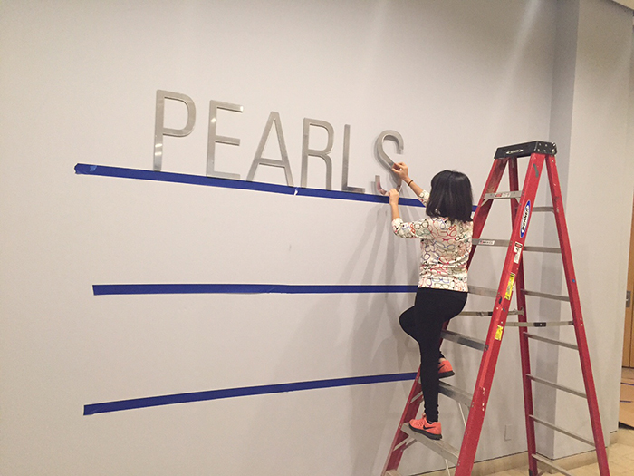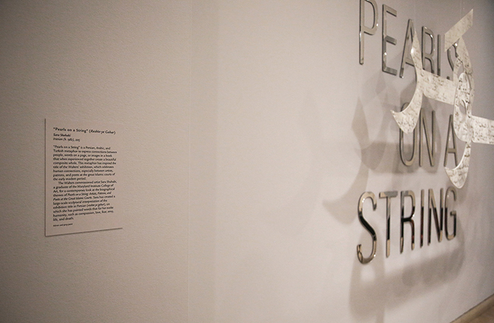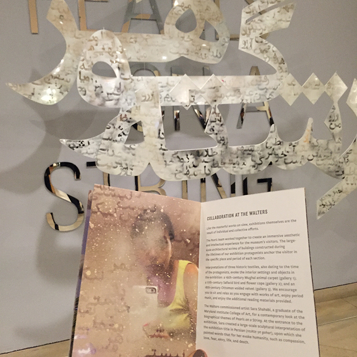 موزه هنر والترز در بالتيمور آمريكا از «سارا شهابى» دعوت كرد تا با نگاهى نو و مدرن به موضوع زندگينامهاى نمايشگاه ويژهاش، ديوار عنوان نمايشگاه را طراحى كند. عنوان اين نمايشگاه «رشته گوهر (Pearls on a String): هنرمندان، حاميان و شاعران حكومت بزرگ اسلامى» است.