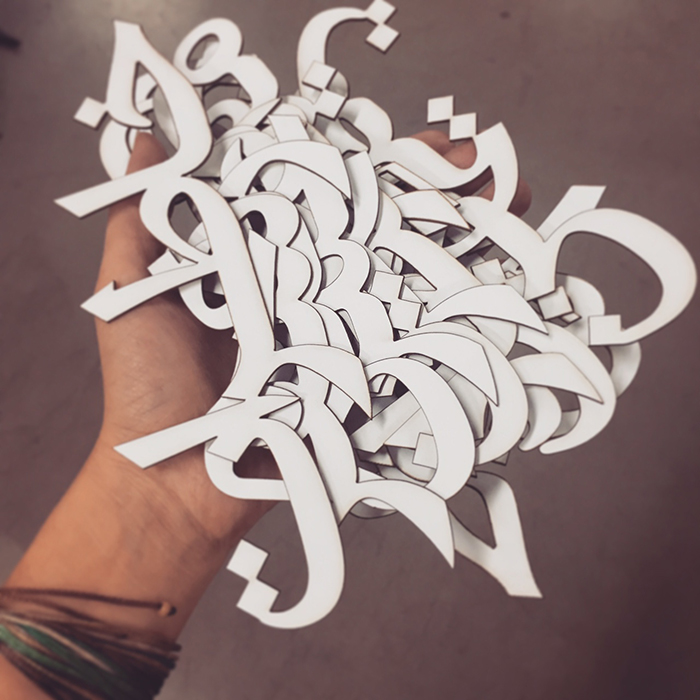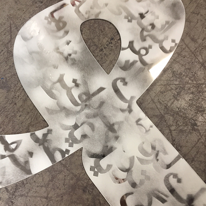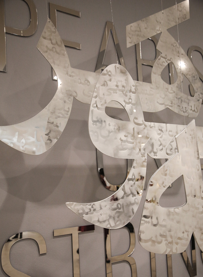 برى اضافه كردن عمق بيشتر به اثر، ايجاد كنتراست و جداسازى بصرى بين عناوين فارسى و انگليسى، كلماتى را كه احساسات و عواطفى نظير محبت، عشق، ترس، زندگى و مرگ را بيان مى كردند؛ روى عنوان اصلى فارسى اسپرى كردم كه به نوعى جنبه self-expression داشت. به طور كلى مى توان ايده اصلى اين كار را فرصتى براى دوباره نگريستن مخاطب در خود يا درونش دانست.