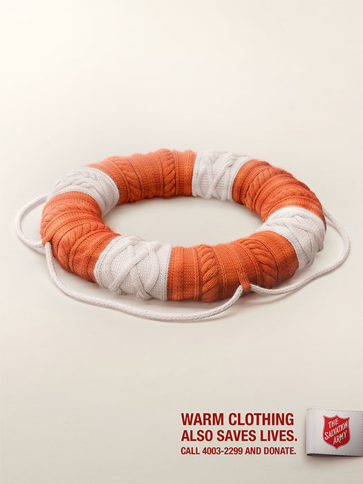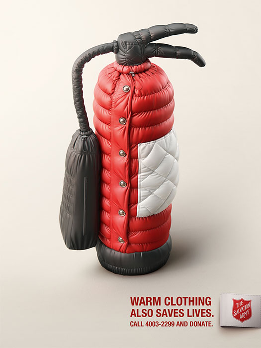 سازمان بین المللی خیریه سپاه رستگاری (Salvation Army) در برزیل کمپین جدیدی راه اندازی کرده است که شرح می دهد چگونه اهدای لباس های گرم می تواند در سردترین مواقع سال، زندگی ها را نجات دهد. استودیو McCann به عنوان مسئول طراحی این کمپین ،مجموعه ای از پوسترهای تبلیغاتی که شامل یک کپسول آتش خاموش کن و یک حلقه نجات غریق است را طراحی کرد که لباس های گرمی مانند کت چرمی و شال های بافتنی تن این وسایل شده بود.