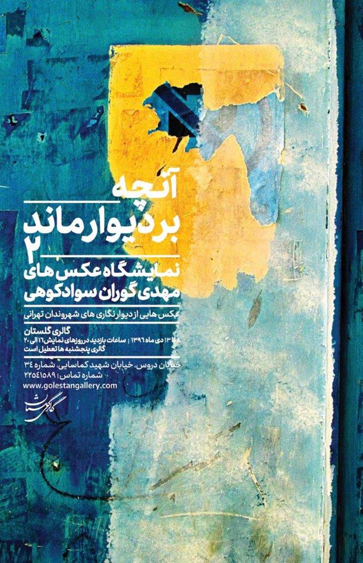 نمایشگاه عکس « آنچه بر ديوار ماند٢ » که شامل عکس های مهدی گوران سوادکوهی از ديوارنگاری شهروندان تهرانی با نام « آنچه بر ديوار ماند٢ » است در گالری گلستان برگزار خواهد شد. این نمايشگاه از روز شنبه ٩ دی ماه آغاز خواهد شد و تا چهارشنبه ١٣ دى ماه ١٣٩٦ ادامه خواهد داشت. گالری گلستان در تهران، دروس، خيابان شهيد كماسايی، شماره واقع می باشد.