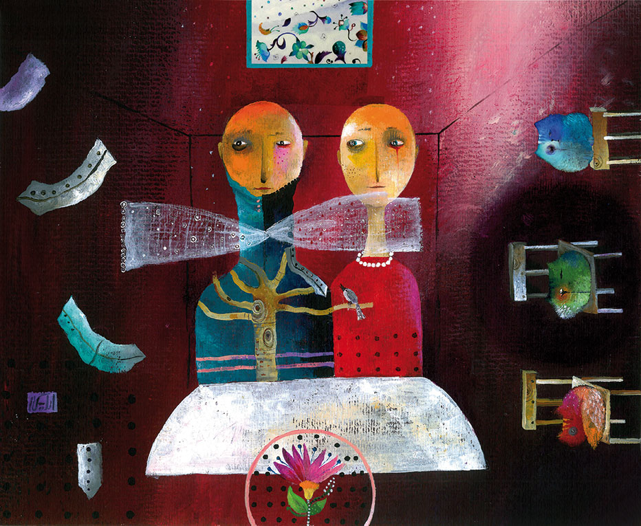 «من بازی را دوست دارم؛ بازیهای کودکانه! بازیهایی که در ذهنم اتفاق میافتد. مثلا بازی خرگوشها، بازی گربهها، برف بازی در دهکدههای فراموش شدهى ذهنم و ذهن انسانها. انسانهایی که کودکیهایشان بازی نداشت…من با رنگهایم نقش این بازیها را میزنم. تاب بازی گربهها در دهکده کودکی، دویدن خرگوشها و دور شدنها… من همه را به به بازی با آنها دعوت مىكنم… همگی به رنگهای کودکی دعوتید! همگی به کودکی دعوتید!»