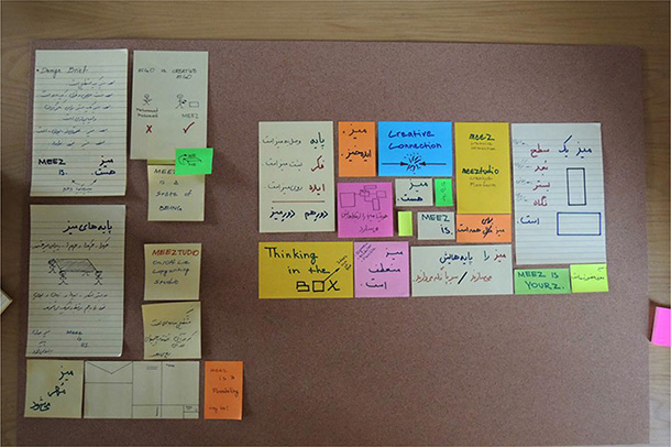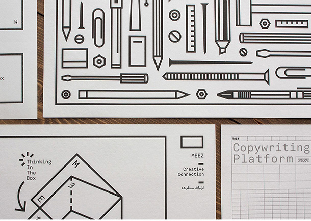«اميد نعم الحبيب» طراح هويت بصرى ميزتوديو درباره آن مى گويد: «خودِ میز به عنوان یک سفارشدهنده یا یک برند میخواست دارای هویت بصری یا به اصطلاح «آیدنتیتی» شود. هویتی که کانسپت اولیه میز در آن رعایت شده و بطور پیوسته و مداوم کاربرد هم داشته باشد. در ضمن تولید متریال کاغذیِ آن اقتصادی هم باشد، قابل گسترش بوده و آن ایدهی پلتفرم بودن هم در خودش داشته باشد. اینکه چه شد که به اینجا رسید و از همهی شلوغبازیها و مسیرهای محتلف به یک کادر مستطیل ساده وصل شدیم بسیار طولانیاست؛ اما خلاصهی ماجرا این بود که من به عنوان طراح پروژه که با محمد از قبل دوست بودم و از ایده و جزییات کارش خبر داشتم برایم بسیار پیچیده بود تا بتوانم هویتی ساده و گویا طراحی کنم تا این ویژگیها یکجا در آن نمود پیدا کند بنابراین طراحی این هویت بصری را در طول یک پروسهی چندمرحلهای انجام دادم. هر بخش را با کلی توقف و مکث پیش بردم و سعی کردم با مطالعه و به اشتراک گذاشتن ایدهها با محمد به مرحله بعدی بروم.
