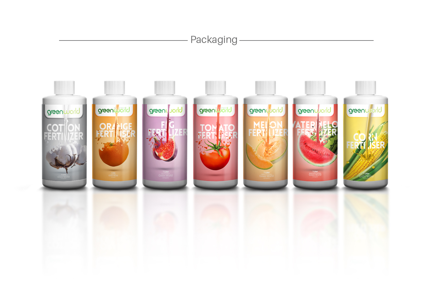 بسته بندی مجموعه محصولات نیز بر اساس شکل فیزیکی محصول به اجرا رسیده اند. این ترکیبات به صورت مایع و مختص هر محصول کشاورزی تولید و عرضه می گردد، بنابراین در طراحی بسته بندی آن، کود مایع از بالای کادر همرنگ با محصول مرتبط به صفحه ورود کرده و باعث شکل گرفتن بخشی از آن محصول می گردد.»