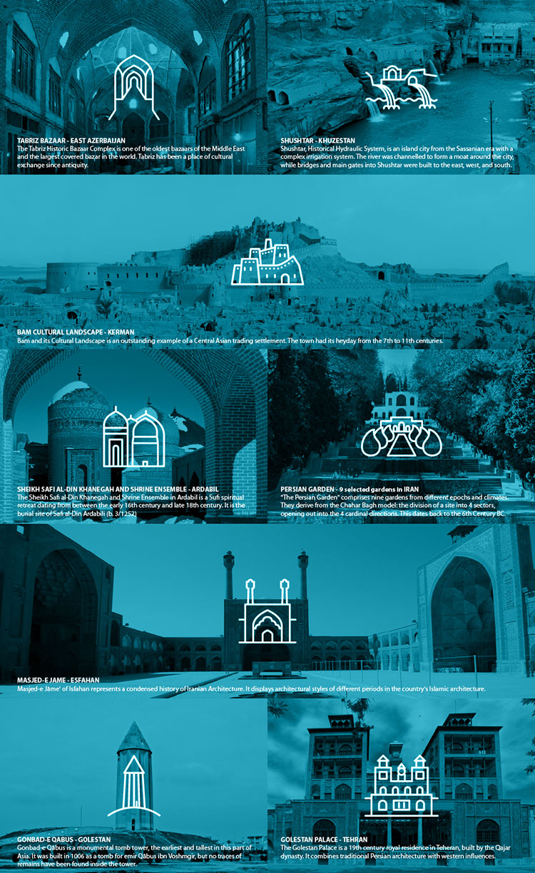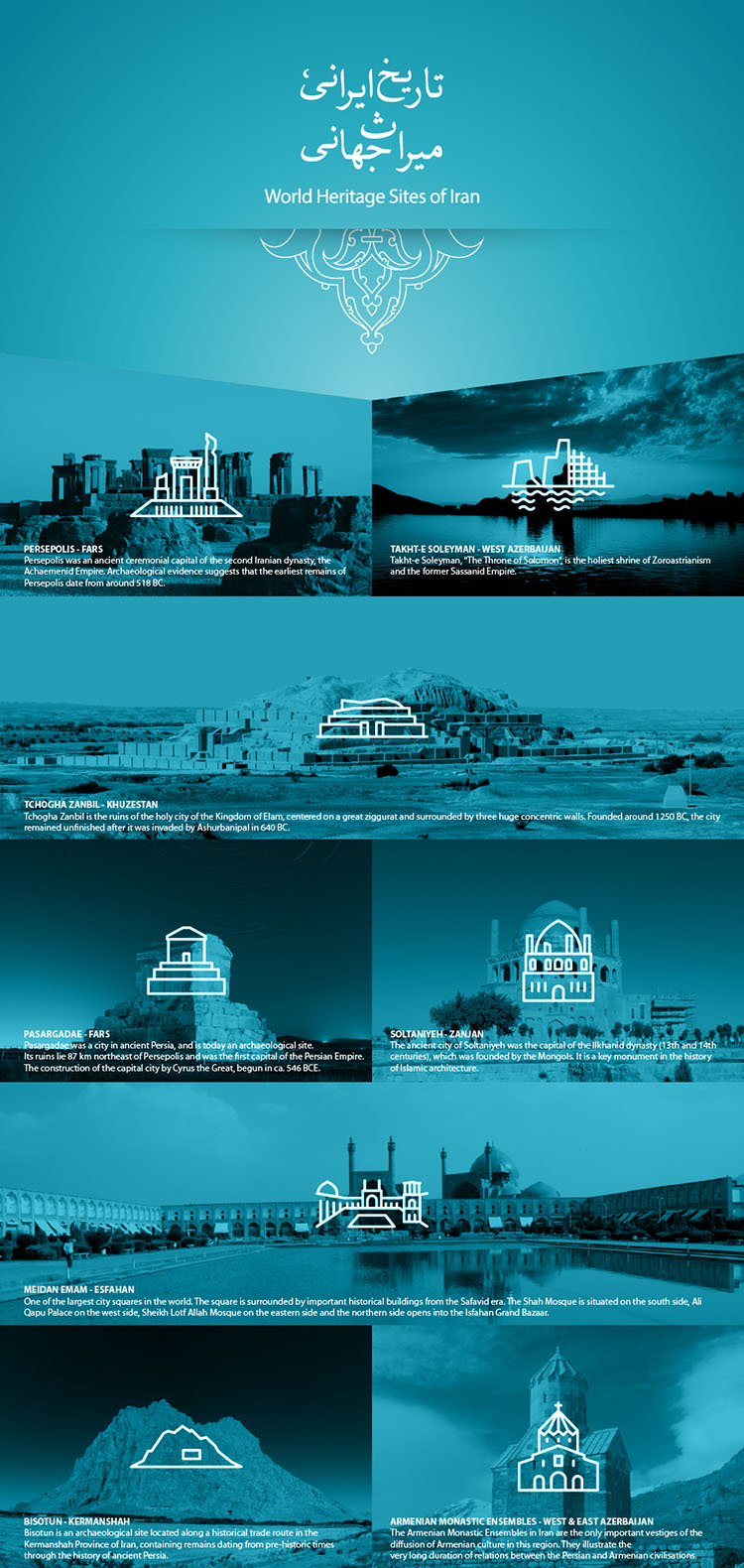 « معرفی آثار میراث ایران ثبت سازمان یونسکو، متناسب با مقیاس جهانی مخاطبین و نمایش متناسب شاخص های بناها پروژه ای بود که سال ۹۲ در شرکت” طوسی” و با کار گروهی از محققان، طراحان گرافیک، معماران و عکاسان انجام شد.