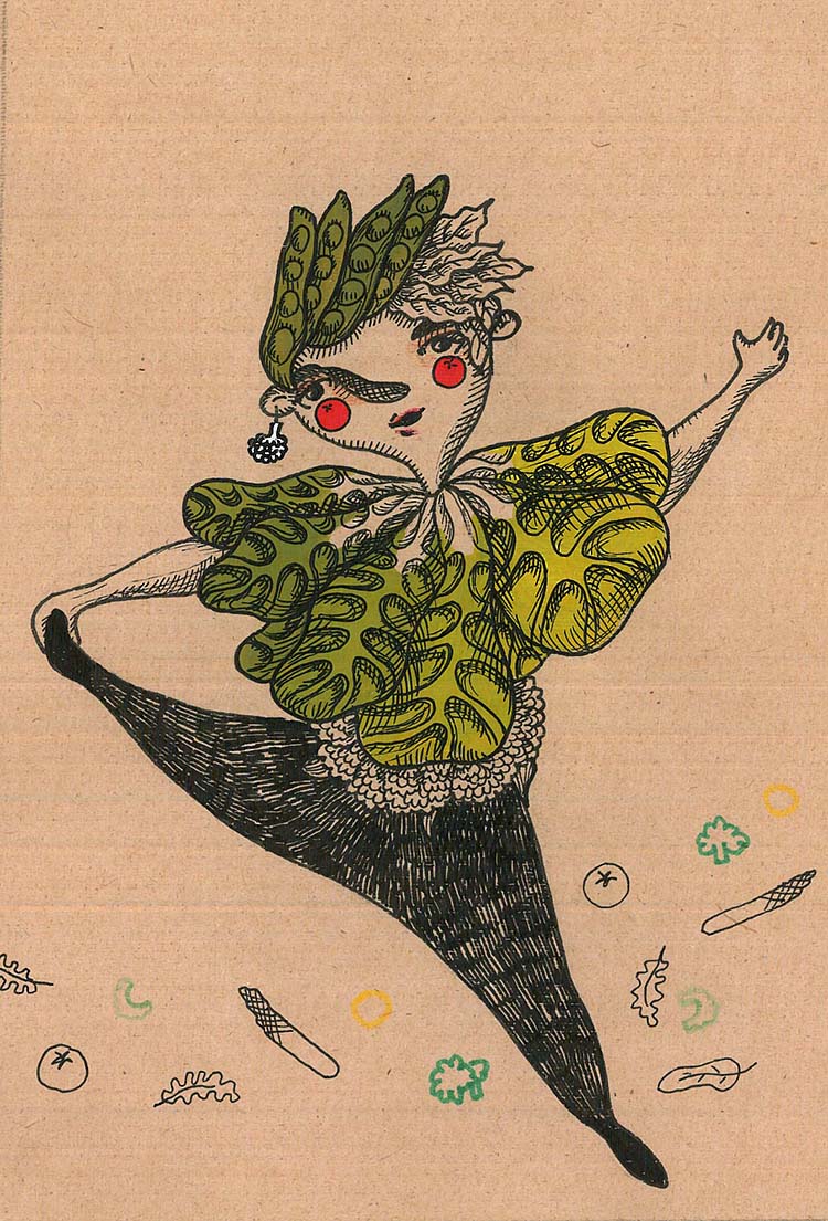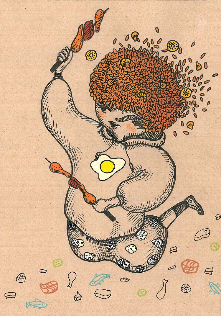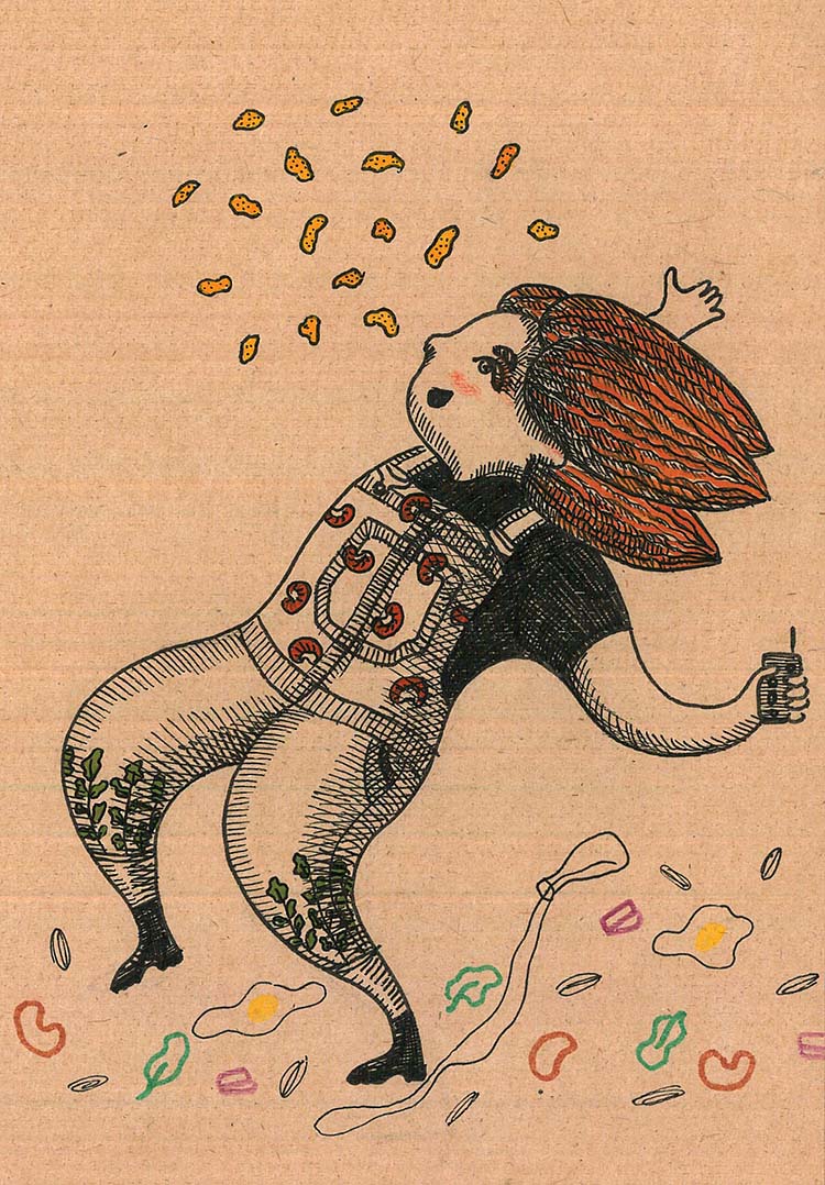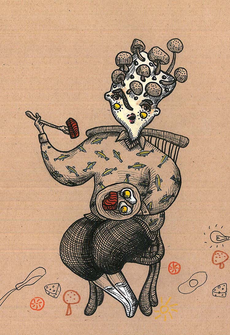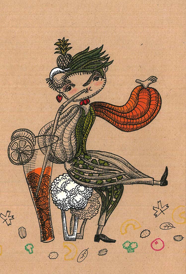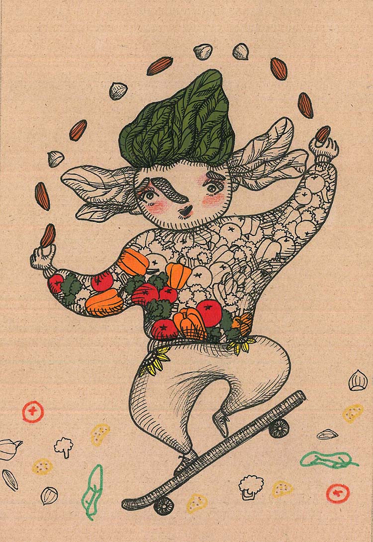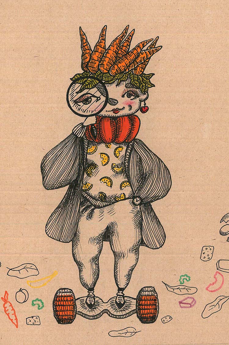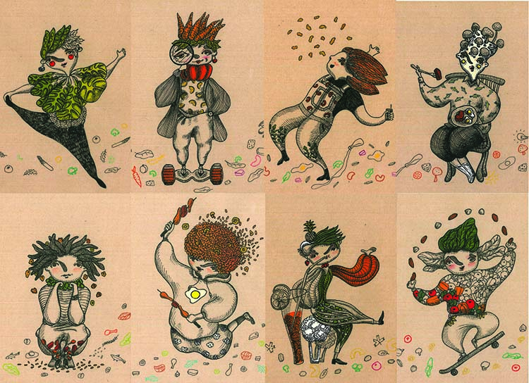 « پروژه دانشجویی تصویر سازی ویتامین ها با هدف آموزش برای گروه سنی کودک و نوجوان در نظر گرفته شده است. شروع پروژه با تحقیق در مورد خواص و ویژگی های ویتامین ها بود که من مجموعه ای از خوراکی هایی که حاوی این ویتامین ها هستند را به طور مجزا برای هر ویتامین طراحی کردم. برای کارکتر سازی سعی کردم با توجه به گروه سنی و سبک و استایل انسان مدرن الهام بگیرم و خوراکی ها را با بخش هایی از کارکتر تلفیق کنم که با هم همخوانی داشته باشند و کارکتر را جذابتر کنند. برای مثال در کارکتر A که شخصیت کنجکاو و ماجراجویی دارد از هویج برای موهایش، کدوحلوایی به عنوان یقه لباسش، لنز جلوی چشمش که مفهوم بهبود بینایی ویتامین را می رساند و چرخ های اسکوتر که تبدیل به آب پرتقال شدند استفاده کردم . تکنیک من در این پروژه راپید و گواش بوده است.»
