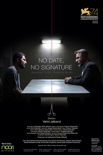 پوستر فیلم سینمایی «بدون تاریخ، بدون امضا» به کارگردانی وحید جلیلوند و تهیه کنندگی علی جلیلوند ویژه جشنواره فیلم «ونیز» رونمایی شد که این پوستر را سیروس سلیمی طراحی کرده است.