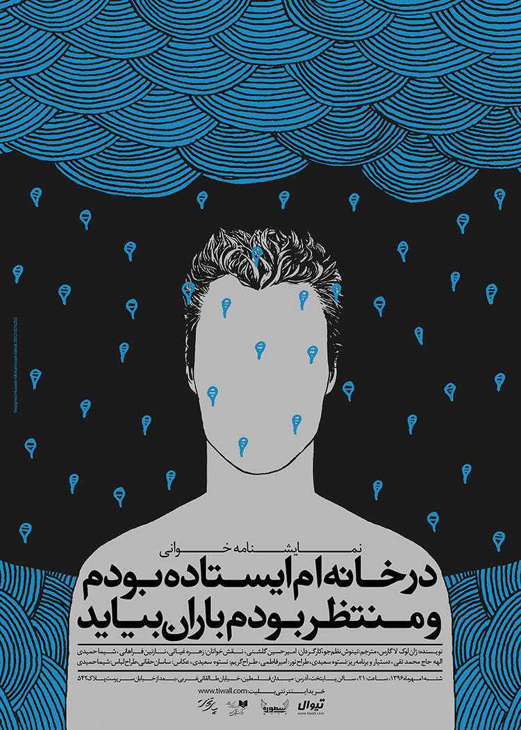 پوستر نمایشنامه خوانی در خانه ام ایستاده بودم و منتظر بودم باران بیاید توسط حسین محمدی وحیدی طراحی و اجرا شده است.