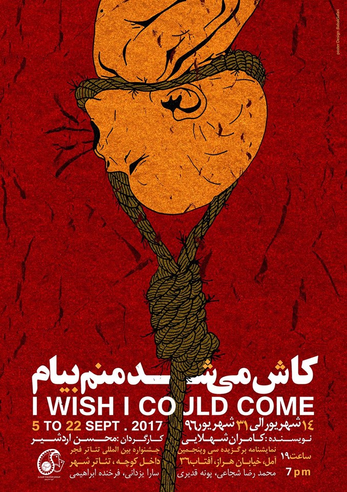 پوستر نمایش «کاش می شد منم بیام» توسط بابک صفری طراحی و اجرا شده است.