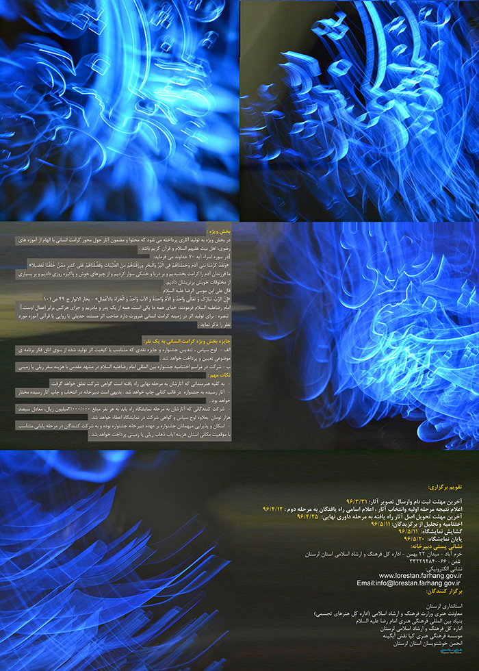 پوستر پانزدهمین جشنواره خوشنویسی ملی رضوی توسط سجاد همتی طراحی شده است. بنا به گفته طراح پوستر: روش اجرای این اثر ؛ تایپوگرافی با نور وسایه ها و استفاده از عکاسی دیجیتال بدون کمترین دخالت نرم افزار های طراحی بوده است. گفتنی است این پوستر به سفارش اداره کل فرهنگ ارشاد اسلامی استان لرستان انجام شده است.