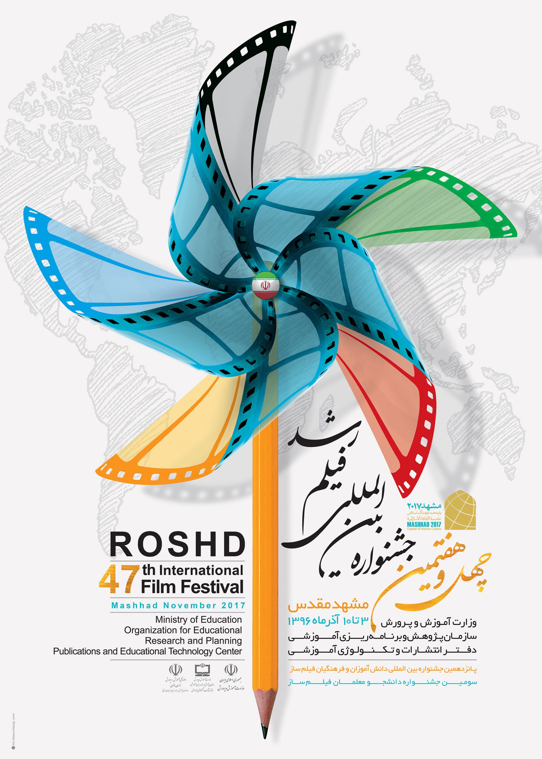دبیر چهل و هفتمین جشنواره بینالمللی علمی، آموزشی و تربیتی فیلم رشد با اشاره به طرح پوستر جشنواره اظهار کرد: هدف این بوده که طرح پوستر ضمن سادگی، مفاهیم بسیاری داشته باشد، در این پوستر نگاتیوی از پنج رنگ که نشان پنج قاره است روی یک فرفره که نشان نشاط دانشآموزان است، طراحی شده و در وسط فرفره آرم جمهوری اسلامی قرار گرفته که بر تمام قارهها نیز سایه انداخته است که نشان میدهد این جشنواره با محوریت ایران برگزار میشود، تصویر مداد نیز نماد آموزش است.