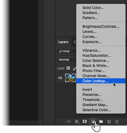 برای شروع وارد فوتوشاپ شوید و عکسی را که می‌خواهید روی آن ویرایشی تازه اعمال کنید، در محیط این ویرایشگر قرار دهید. سپس به سراغ پنل لایه‌ها بروید و با کلیک روی آیکون Adjustment Layer، گزینه Color Lookup را انتخاب کنید.