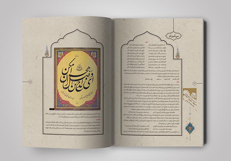 نسخههای زیادی از قرآنهای قدیمی در آرشیوم داشتم که به زیبایی تذهیب و حاشیه نویسی شده بود. با الهام گرفتن از آنها سعی کردم که صفحه بندی کتاب، به شکل کتابهای معمولی و دارای استایلی ثابت نباشد بلکه به شکل روایی آن را طراحی کردم. از آنجایی که در متن کتاب به تصویرگری از حیث حسی بودن اثر پرداخته شده بود، سعی کردم خیلی حسی و با تکیه بر مطالب هر صفحه از کتاب جلو بروم، نه به شکلی مهندسی و ریاضیوار.