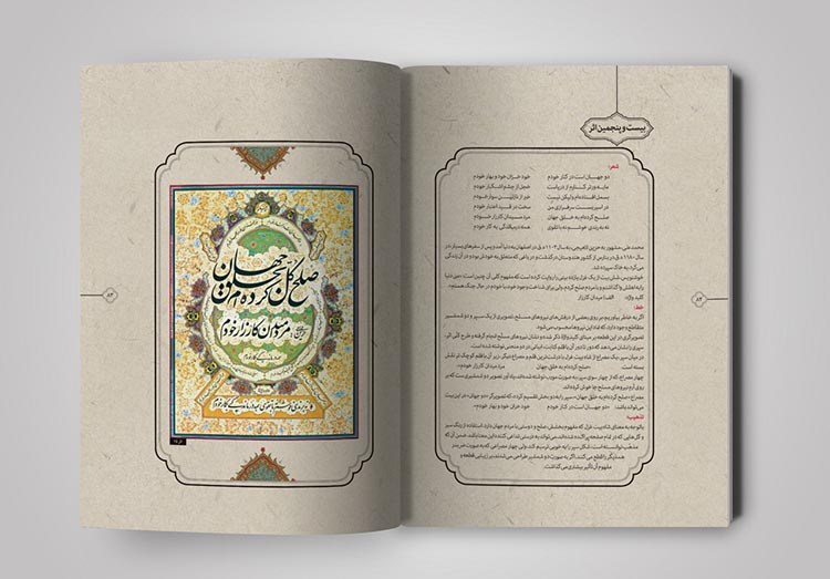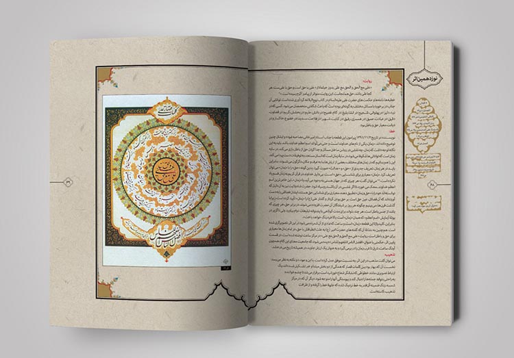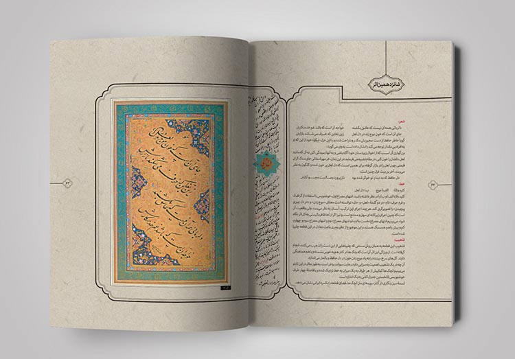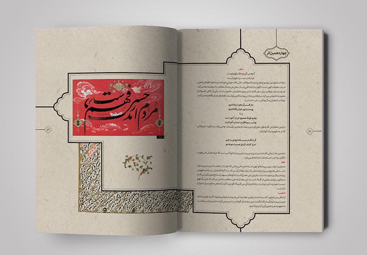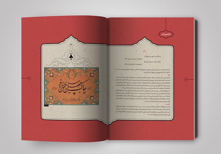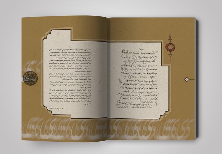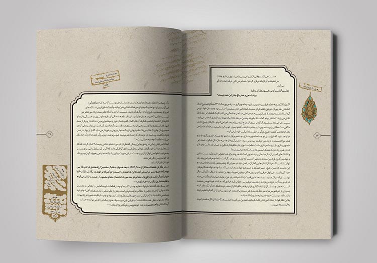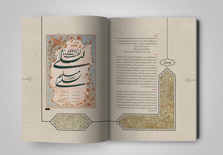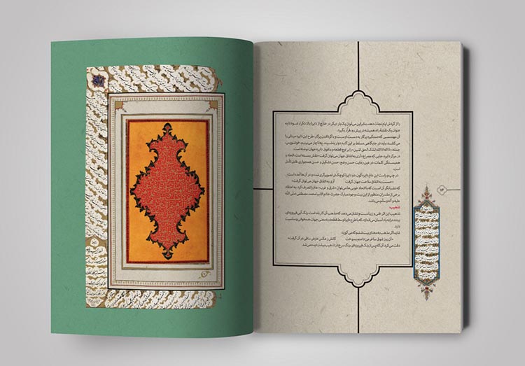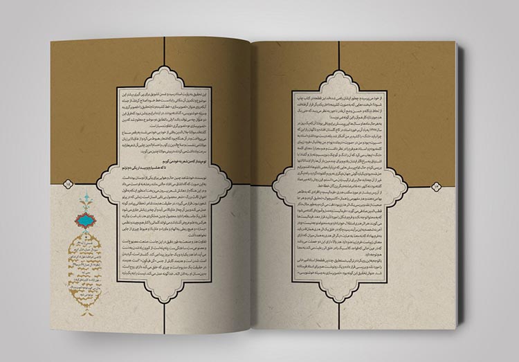 نسخههای زیادی از قرآنهای قدیمی در آرشیوم داشتم که به زیبایی تذهیب و حاشیه نویسی شده بود. با الهام گرفتن از آنها سعی کردم که صفحه بندی کتاب، به شکل کتابهای معمولی و دارای استایلی ثابت نباشد بلکه به شکل روایی آن را طراحی کردم. از آنجایی که در متن کتاب به تصویرگری از حیث حسی بودن اثر پرداخته شده بود، سعی کردم خیلی حسی و با تکیه بر مطالب هر صفحه از کتاب جلو بروم، نه به شکلی مهندسی و ریاضیوار.