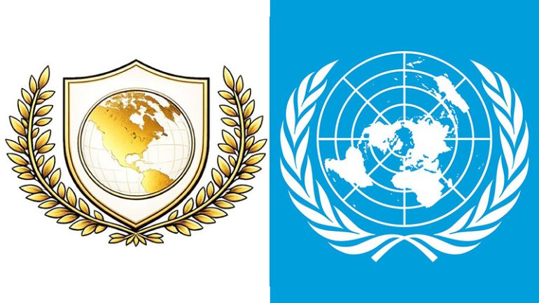 برای مقایسه، نشان سازمان ملل در سال ۱۹۴۵ و توسط تیمی به سرپرستی اولیور لینکلن لاندکوئیست طراحی شد. این نشان بر پایه‌ی نقشه‌ای با تصویرسازی آزیموتال و مرکزیت قطب شمال شکل گرفته و با تاجی از شاخه‌های زیتون، نمادی جهانی از صلح، بی‌طرفی و همگرایی بین‌المللی را به نمایش می‌گذارد.