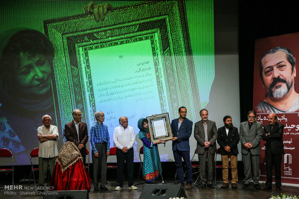 سپس خانواده زنده یاد وحید نصیریان روی صحنه آمدند و لوح تقدیری دریافت کردند. افسانه جابری همسر این هنرمند در سخنانی بیان کرد: از همه دوستانی که به یاد وحید هستند و سعی می کنند یاد او را زنده نگه دارند تشکر می کنم.