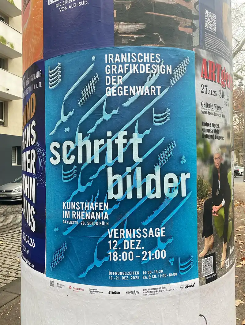 این نمایشگاه شامل ۸۰ پوستر منتخب است که بیش از نیمی از آن‌ها از مجموعه‌ی منحصربه‌فرد پوسترهای ایرانی موزه‌ی «گشتالتونگ» زوریخ انتخاب شده‌اند. گزیده‌ای از این آثار برای نخستین‌بار از ۱۲ تا ۲۱ دسامبر ۲۰۲۵ در فضای فرهنگی و هنری «کونستهافن» شهر کلن آلمان به نمایش درآمده‌اند.