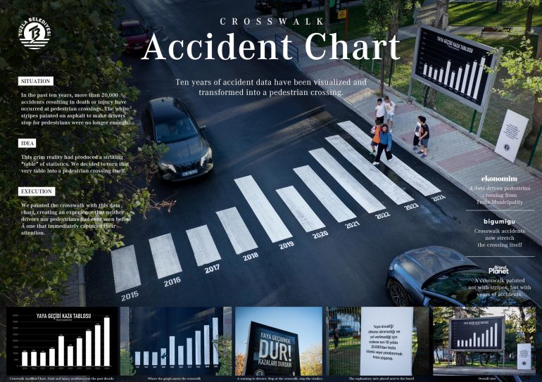 در این طرح، نوارهای سفید خط عابر دیگر فقط مرزی برای عبور عابران نیستند، بلکه هر کدام از آنها تبدیل به بخشی از نموداری زنده شدهاند؛ نموداری که ده سال آمار تصادفات منجر به جراحت یا مرگ عابران را روایت میکند. بر اساس این دادهها، طی یک دهه گذشته بیش از ۲۰ هزار نفر در سراسر ترکیه در اثر حوادث مرتبط با عبور از خیابان آسیب دیدهاند. حالا این آمار تلخ، در قالبی بصری و درست در دل خیابان پیش چشم رانندگان و عابران قرار گرفته است.