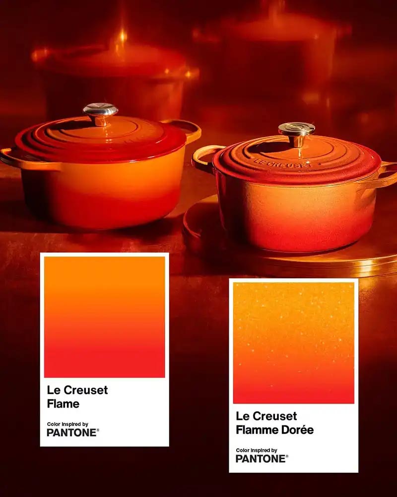 در همکاری جدید با Pantone، این رنگ تاریخی به‌صورت رسمی کدگذاری شده و در کنار آن، طیف تازه‌ای با نام Flamme Dorée نیز معرفی شده است. Flamme Dorée نتیجه فرآیندی دقیق و چندمرحله‌ای در لعاب‌دهی است که در آن یک لایه‌ی سوم مینا، غنی‌شده با مواد معدنی، به سطح محصول اضافه می‌شود. این تکنیک باعث شده رنگ جدید درخشش، عمق و بافتی متفاوت داشته باشد و در عین حفظ ارتباط با گذشته، جلوه‌ای امروزی‌تر ایجاد کند.