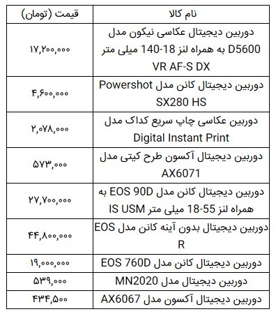 عکاسی·12 شهریور 1399·0قیمت جدیدترین دوربین عکاسی چقدر است؟دوربین دیجیتال کانن مدل Powershot SX۲۸۰ HS به قیمت ۴ میلیون و ۶۰۰ هزار تومان در بازار به فروش میرسد.به گزارش روزرنگ و به نقل از باشگاه خبرنگاران جوان، قیمت انواع دوربین عکاسی در بازار به شرح زیر است: